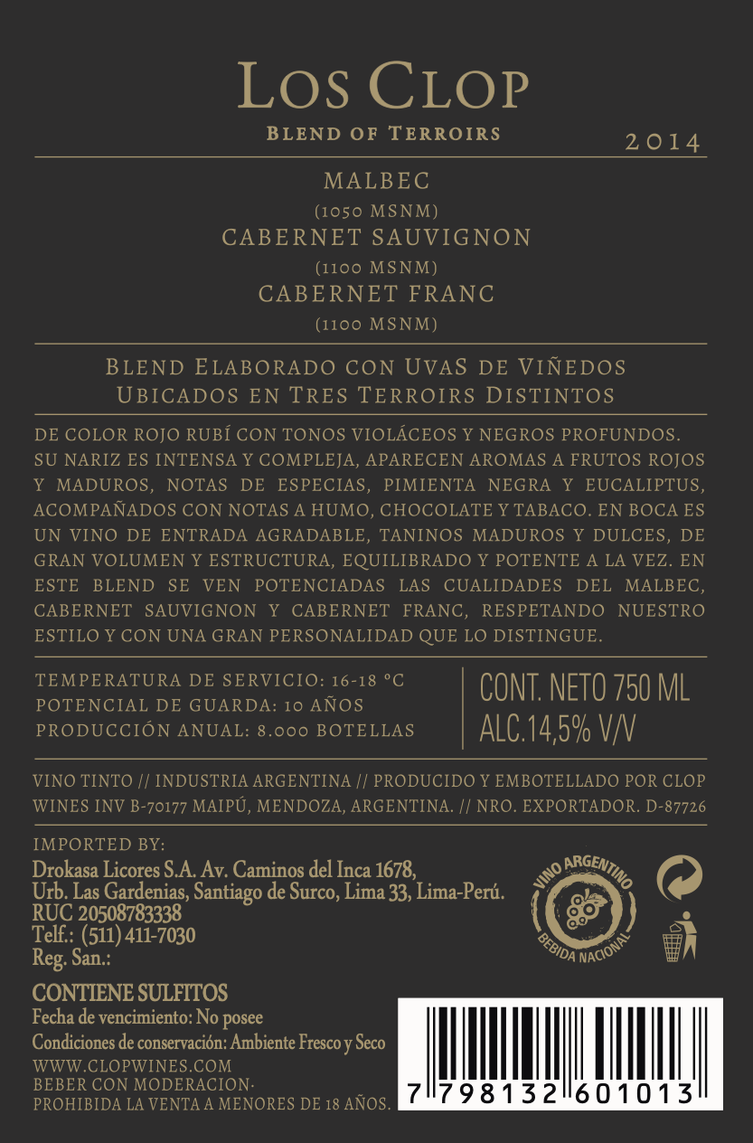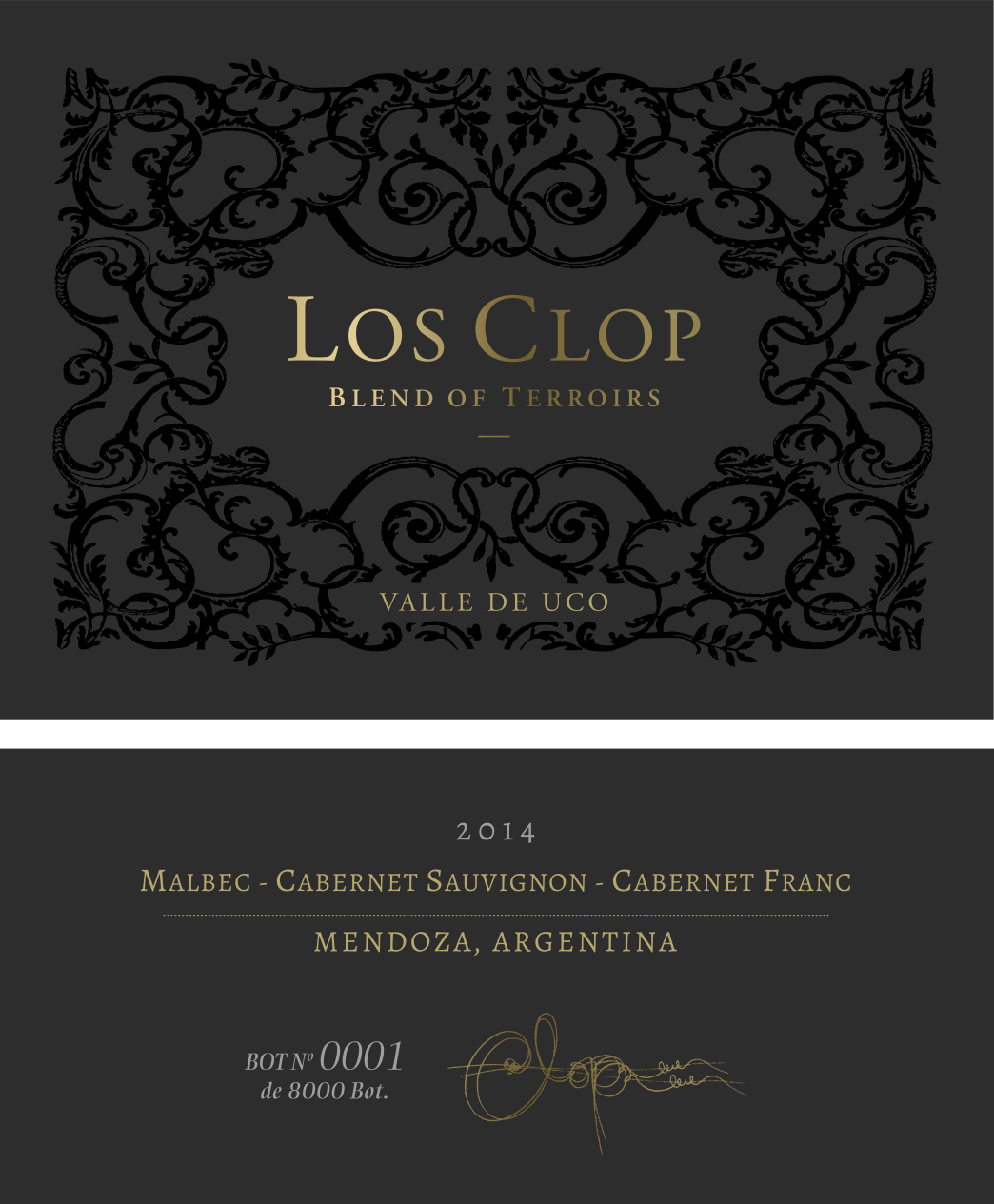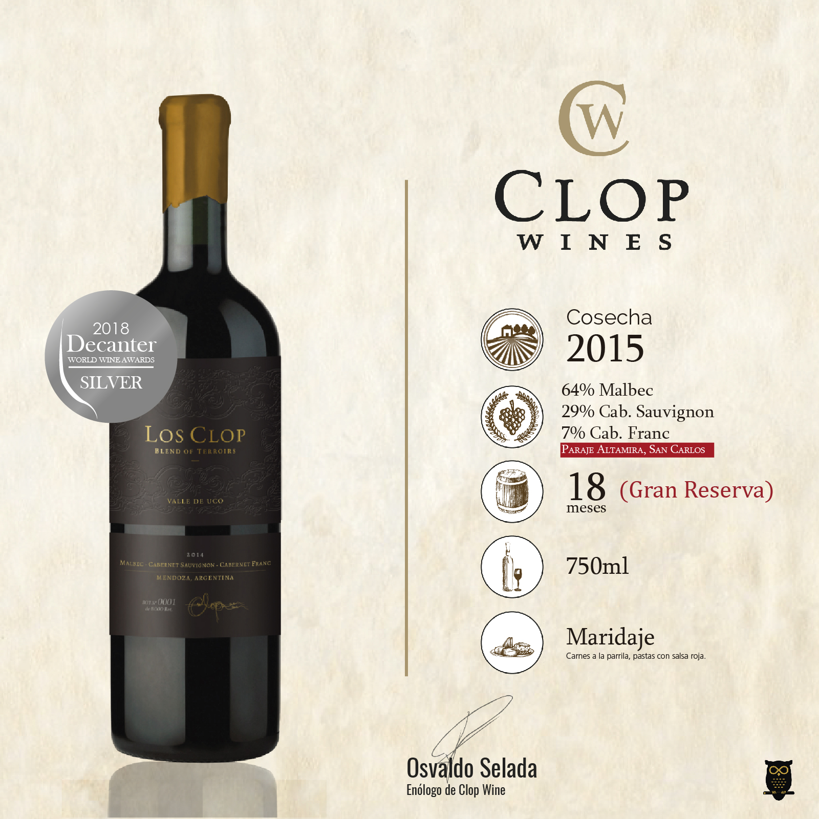 Bodega Clop Wines, País Argentina, Varietal 64% Malbec – 29% Cab. Sauvignon – 7% Cab. Franc, Cosecha 2015, Tipo Tinto, Viñedos Los Chacayes – Valle de Uco, Crianza 18 meses, 90 ptos. Decanter, Enólogo Osvaldo Selada